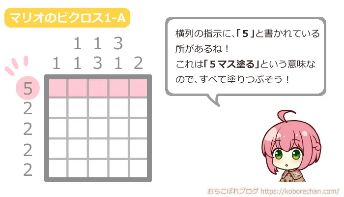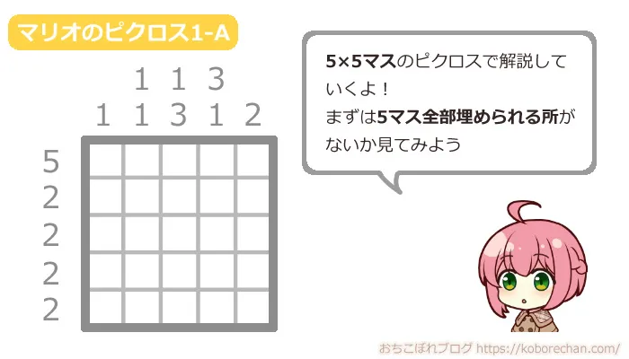 基本のピクロスの遊び方を説明するために、「マリオのスーパーピクロス」の1-Aを攻略していきます