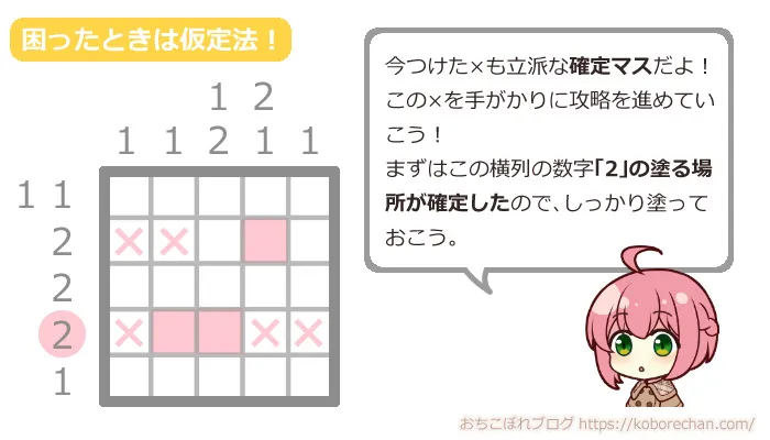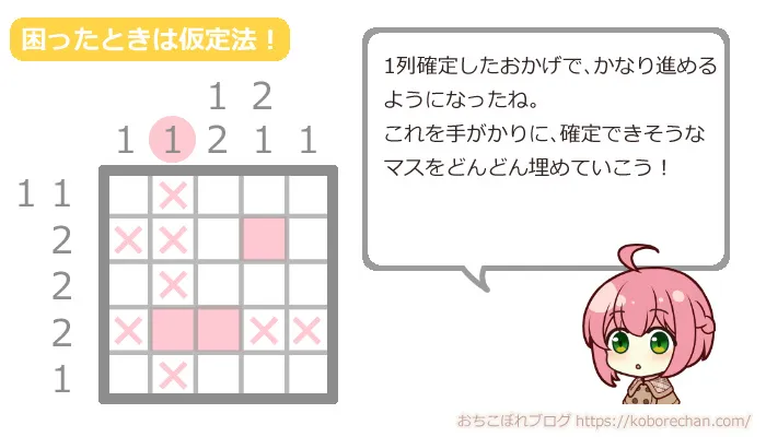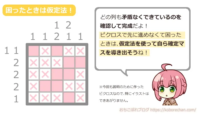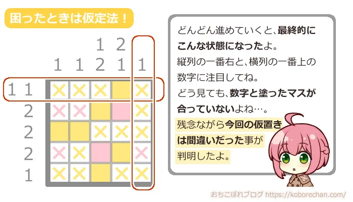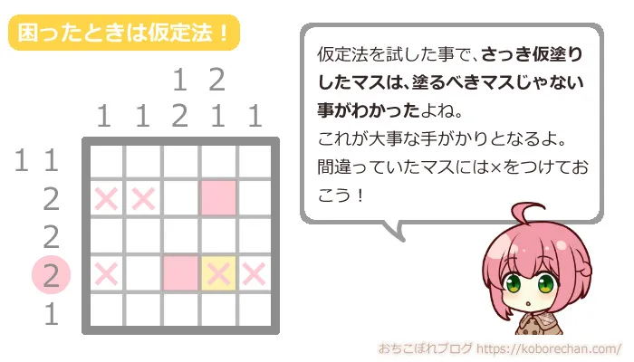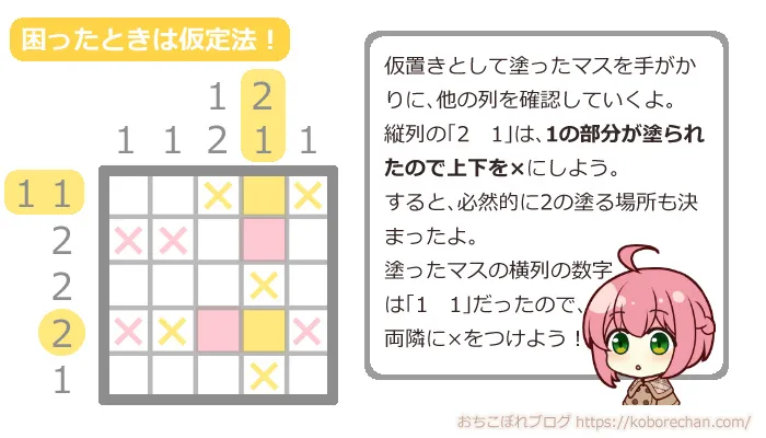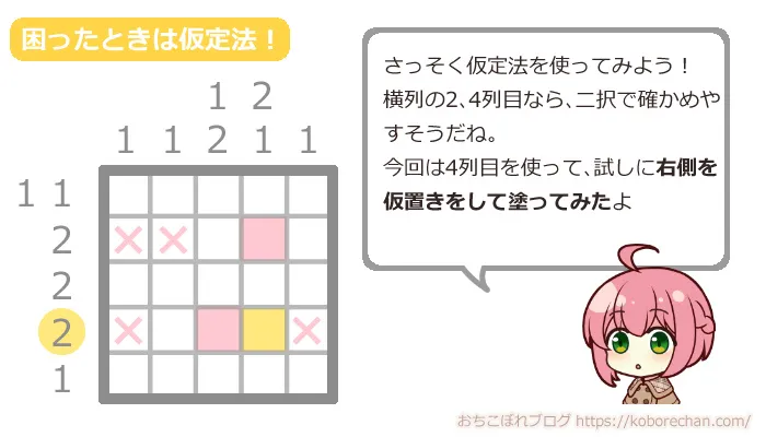 でも大丈夫!次はピクロスの高度なテクニック「仮定法」を使って攻略していきましょう!