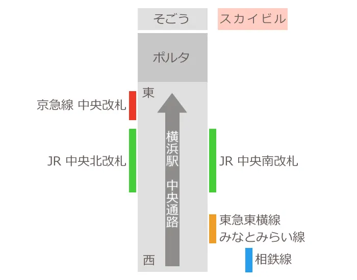 プリティストア横浜店がある「横浜スカイビル」は、横浜駅の中央通路をまっすぐ行くだけで見つけることができます