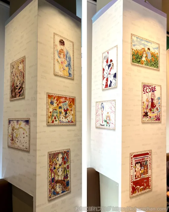 店内は各作品のイラストがずらり。壁面はその期間中の作品、柱は前後半共通で全ての作品のイラストが使用されていました。